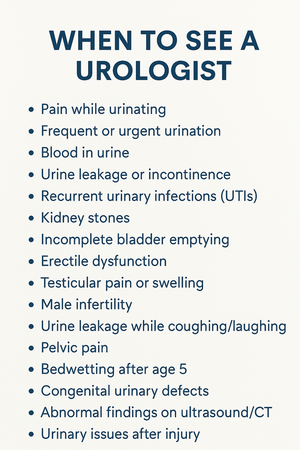 When to visit an Urologist? Here are key situations when you should visit a urologist: Blood in urine (hematuria) Frequent or urgent need to urinate Difficulty in sta...